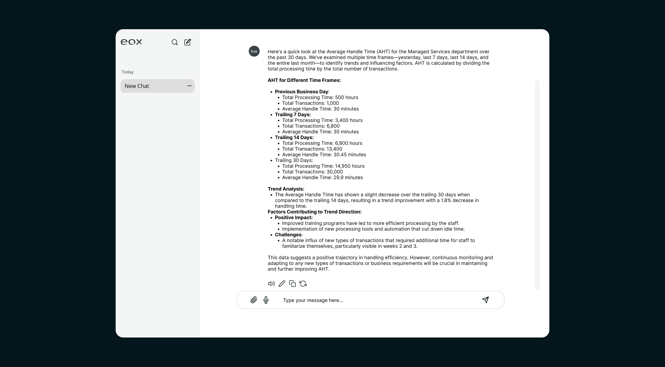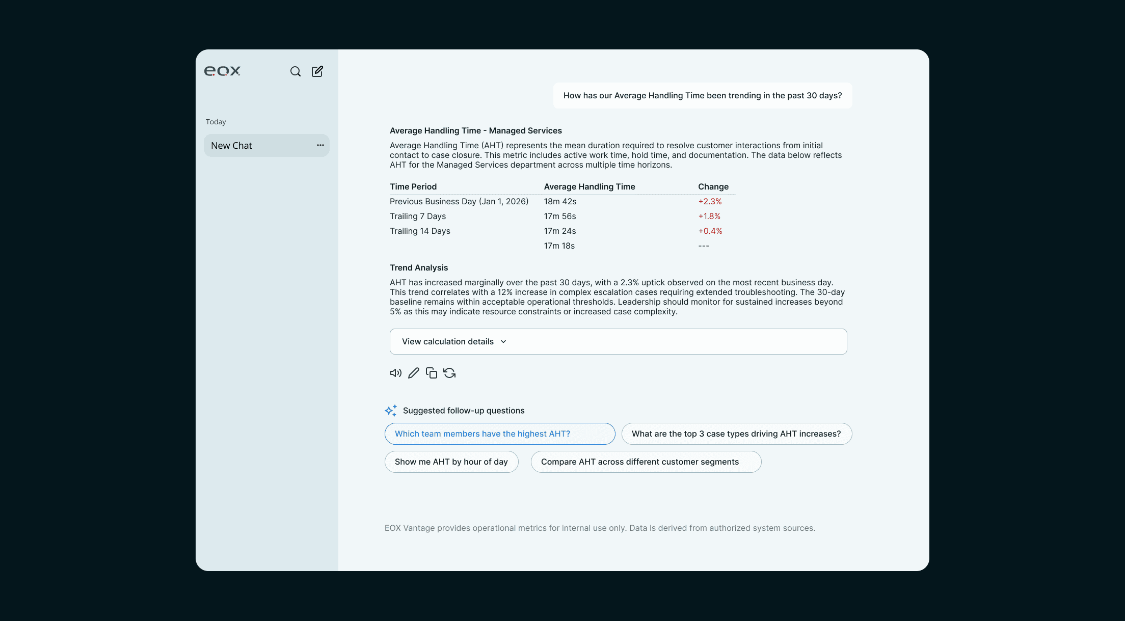 We also discovered users needed to double-check the data used against the calculation. To fulfill this user need, I extended the design so that any metric answer could display calculation logic and source attribution.