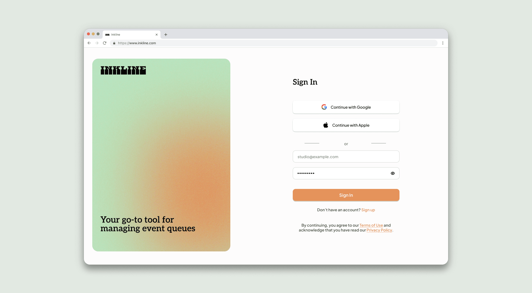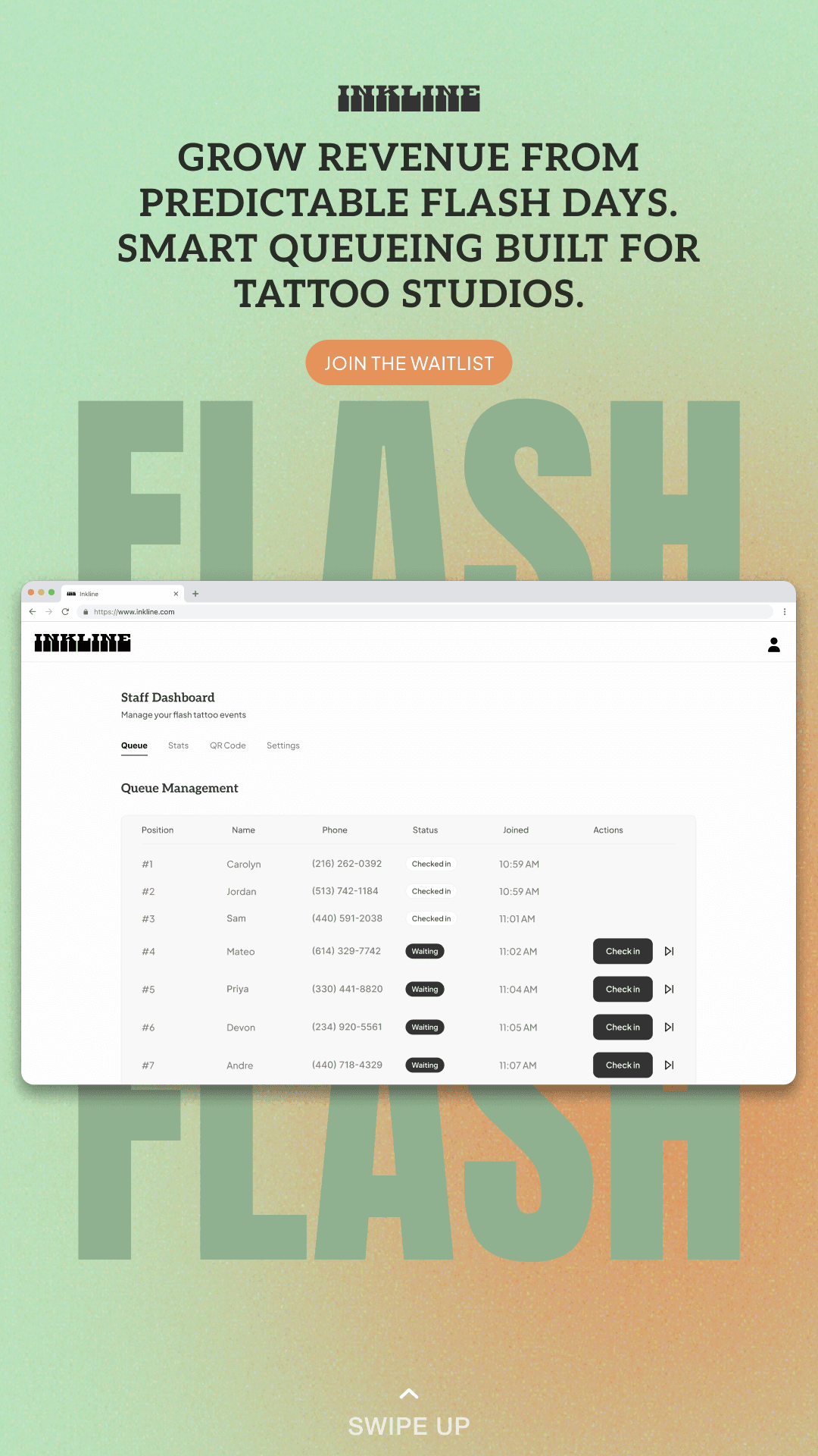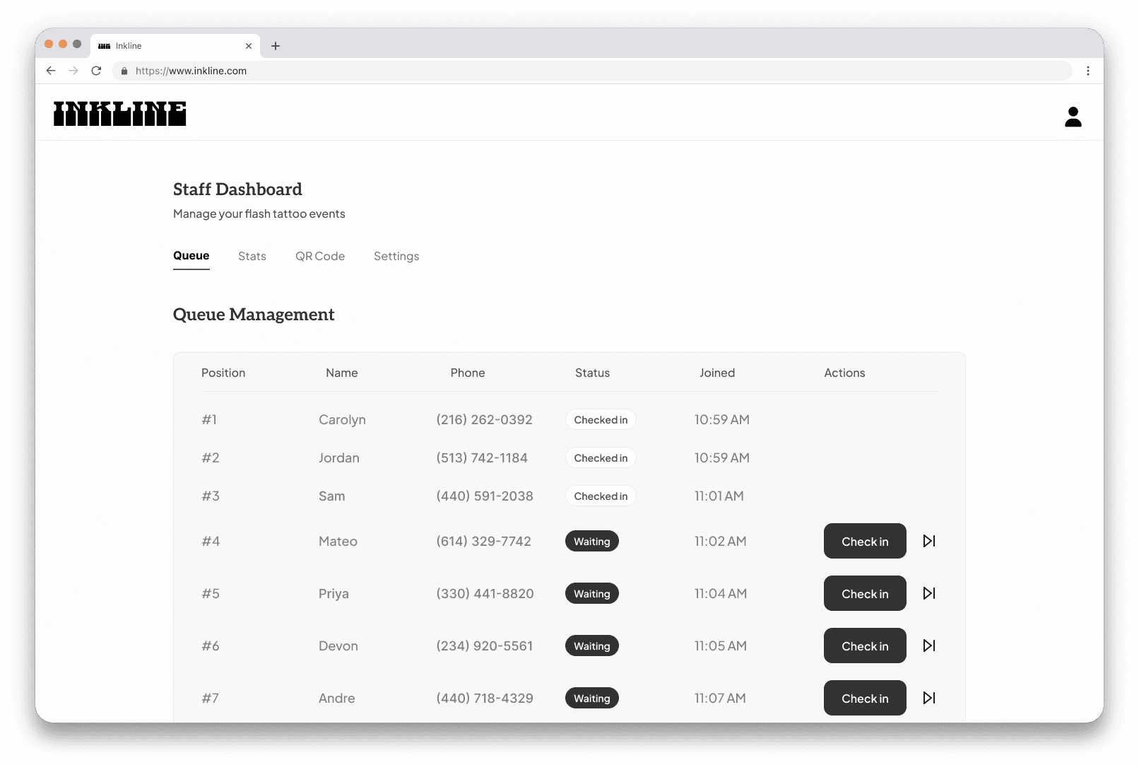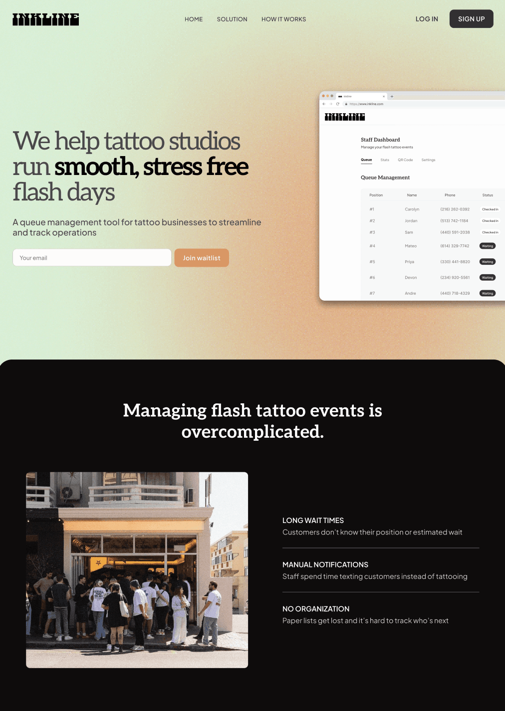 Through landscape research, I identified a market opportunity in the tattoo studio industry by collecting feedback in online forums. We discovered that a variety of challenges emerge during tattoo flash events: revenue loss due to drop-off rates due to frustrated customers waiting in line. Sean also conducted customer discovery with local tattoo artists and identified early interest. We built Inkline, a queue management tool designed for tattoo studios hosting high-volume events, to solve this problem.