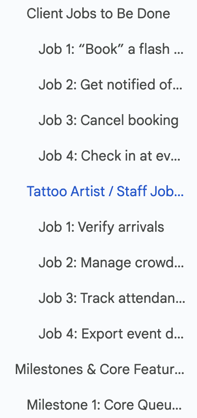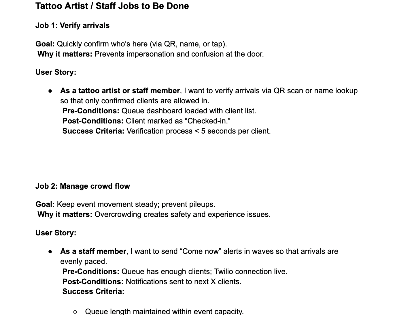 Before designing anything, I created a PRD with User Stories and Jobs to be Done for tattoo studio owners, tattoo studio staff, and customers. I also outlined requirements, constraints, assumptions, and edge cases to approach designing the app with intention. This step aligned my design and engineering decisions around a single source of truth.