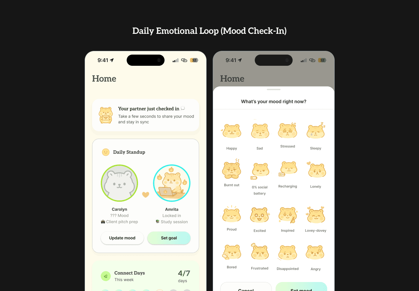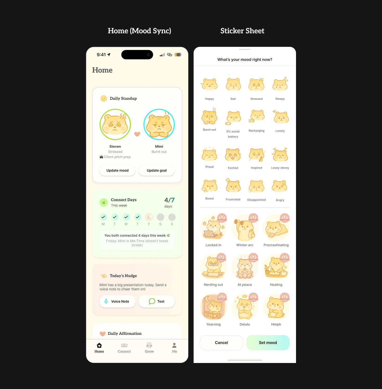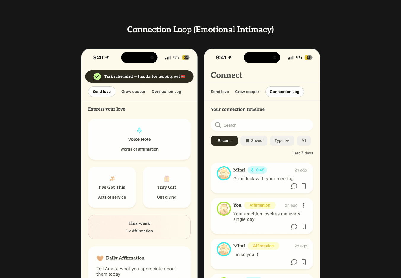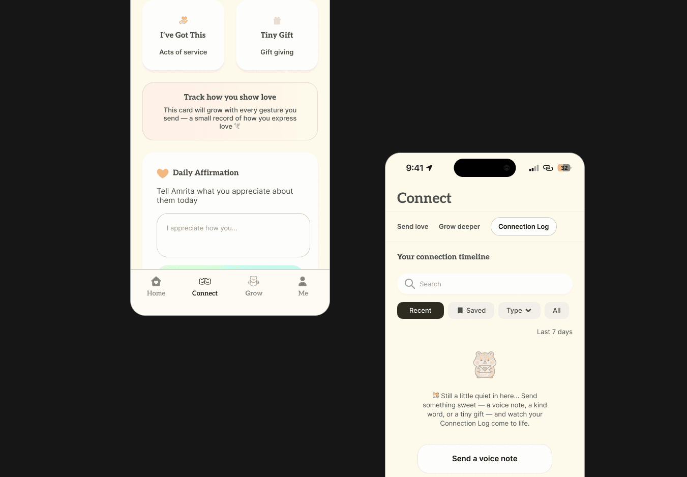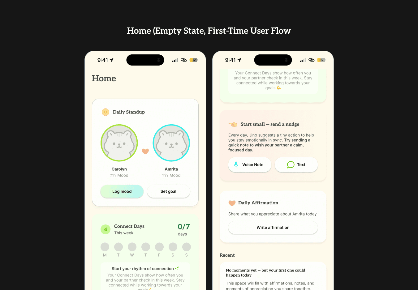 Next, instead of dumping users into a blank home screen, the first-time user flow prompts them to complete key rituals (ex. daily check-ins or sending a voice note). With an example Connect Day streak calendar and preview cards, the empty states also teach the user what the app will feel like once they consistently use the app. This primes users for loops that drive retention.