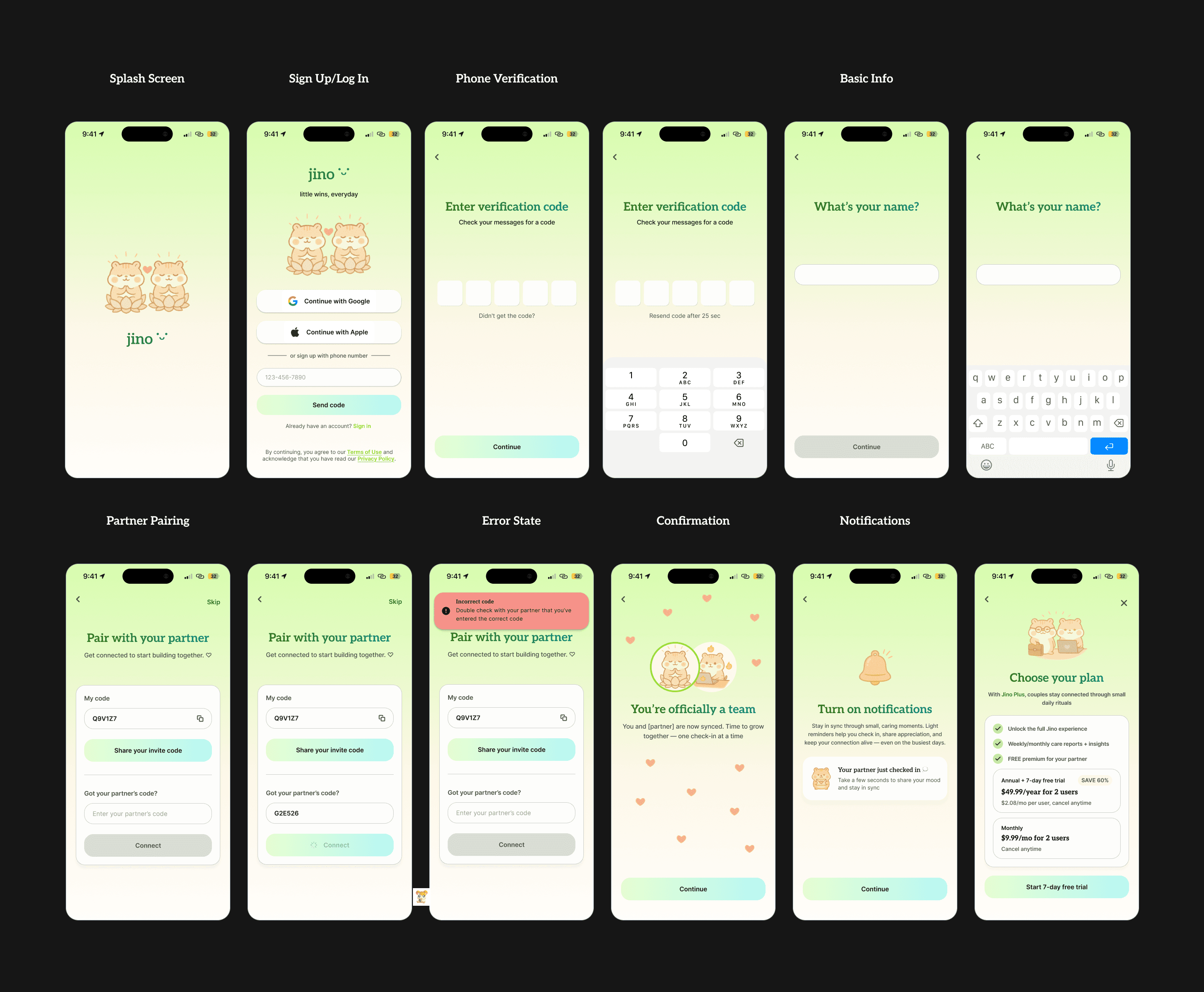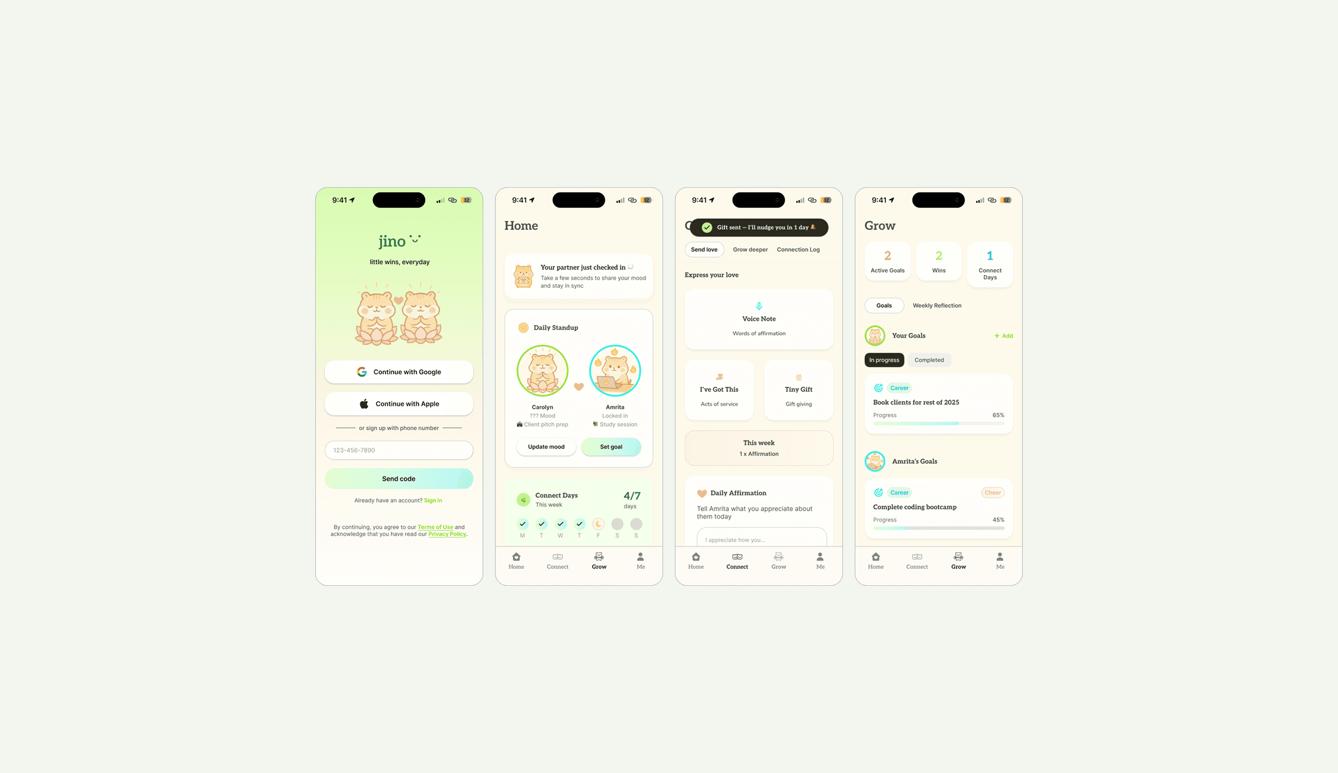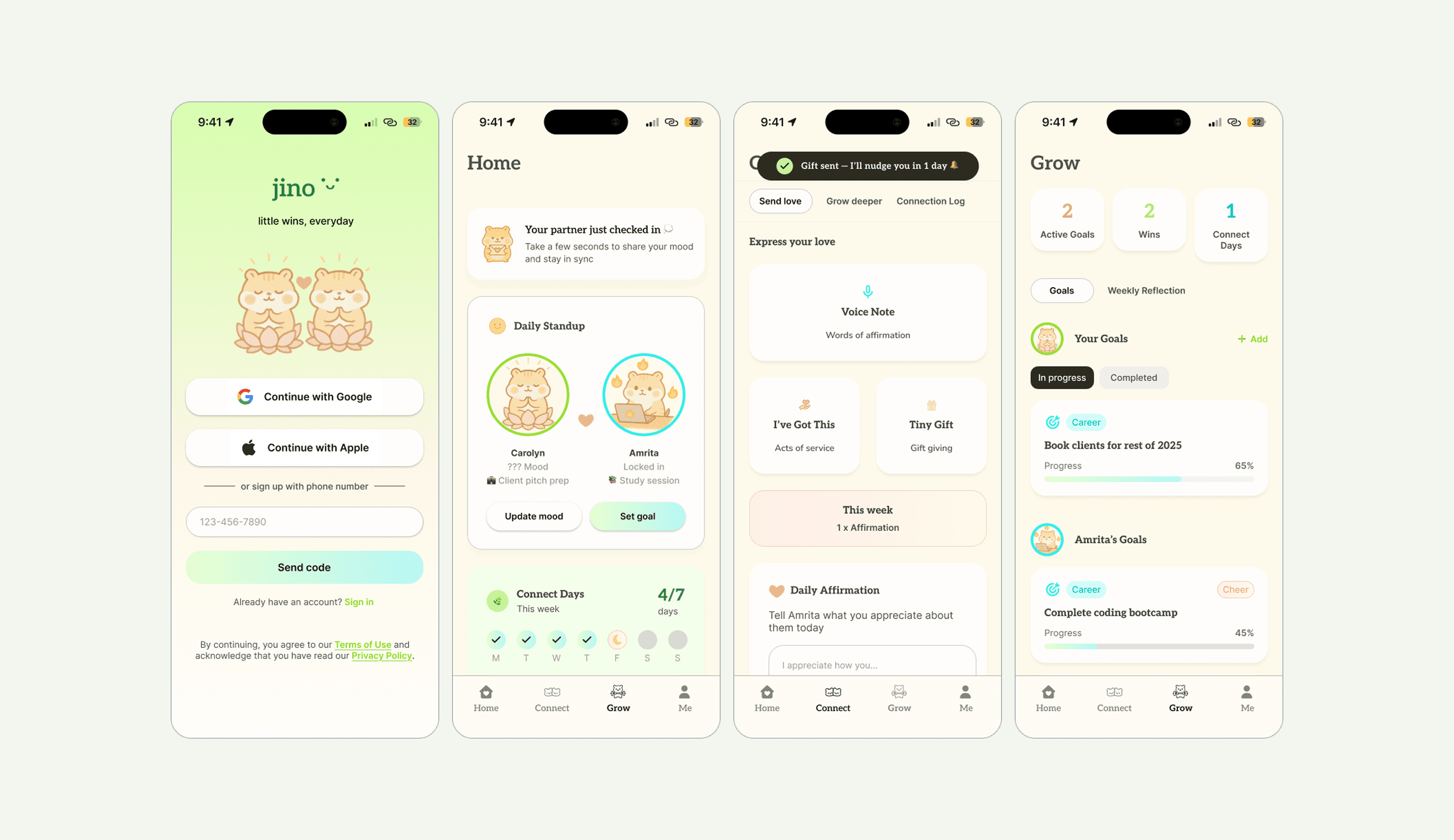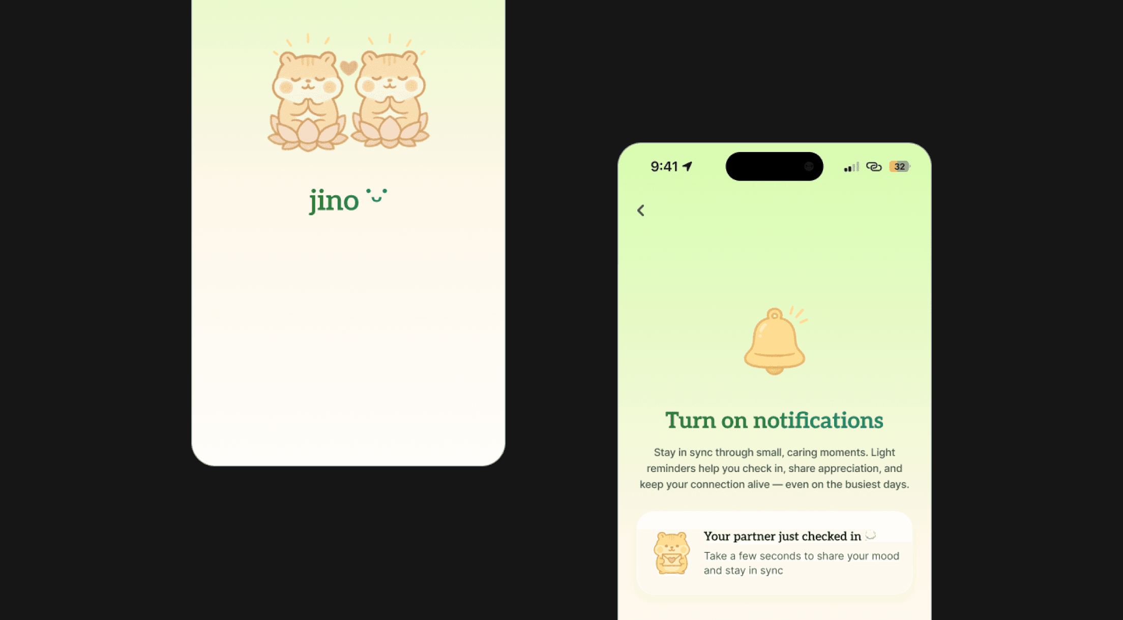 Jino is a relationship growth companion for ambitious, emotionally intelligent couples. It is a lightweight app that creates opportunity for shared rituals for connection, emotional presence, and goal tracking. The goal of Jino is to help couples maintain emotional closeness and personal development while preserving individuality and a strong sense of self.