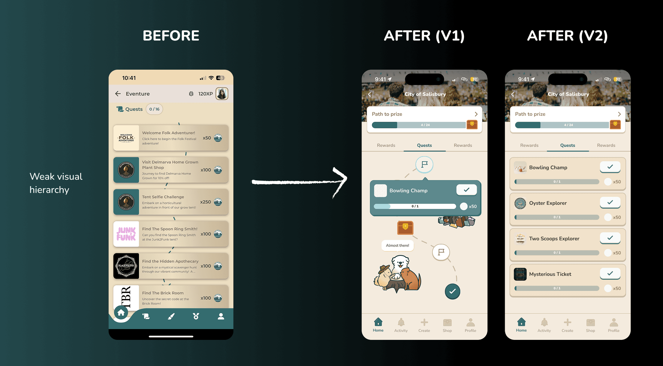 By redesigning the Quest List with clear hierarchy, simplified cards, and stronger visual cues, we turned a dense, overwhelming list into a scannable flow that guides users toward meaningful action.