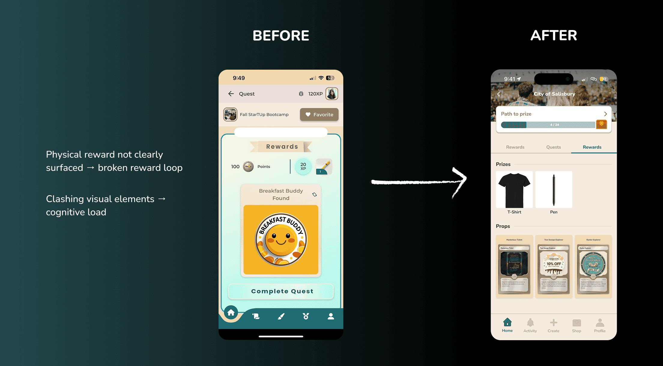 User testing made it clear that new users needed a smoother path to their first win. Our strategy focused on reducing early friction and making the quest → reward loop unmistakable, so users immediately understood the value of Props. The redesign aimed to boost user retention to make Props' business model sustainable after launch.