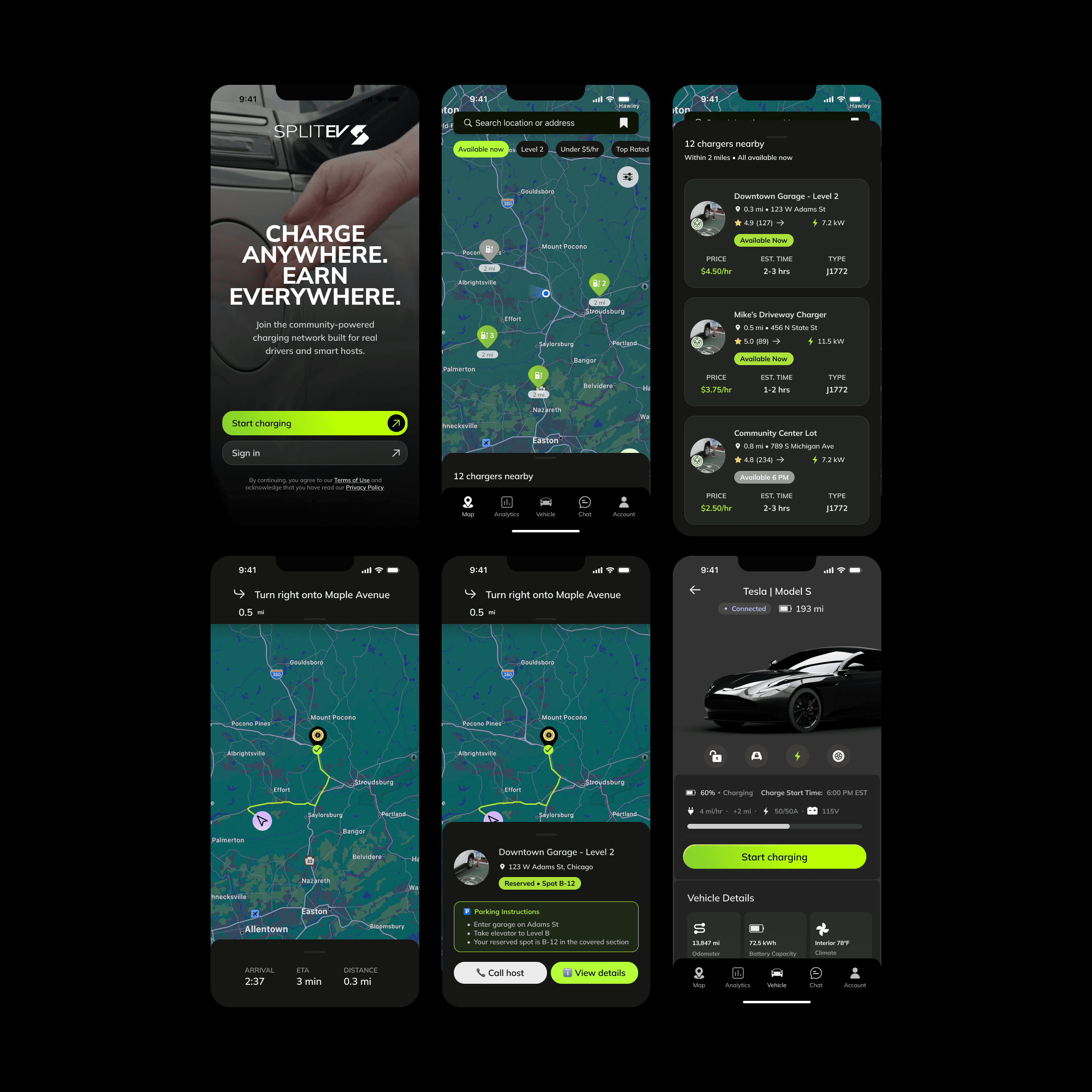 Our goal was to unify the product into a coherent system that real users could test and that engineering could actually build. We used Rapid Iterative Testing and Evaluation (RITE) to uncover friction early, iterate fast, and validate improvements. Over 12 months, through dozens of iterations, we rebuilt SplitEV’s core experience into a launch-ready MVP.